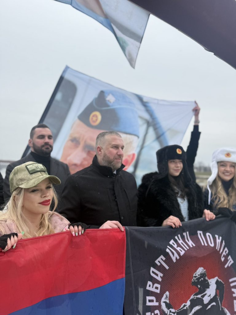Активисти Конзервативног покрета НАШИ приредили су импресиван призор палeћи димне бомбе у бојама руске и српске заставе, чији су се облаци подигли као симбол нераскидиве братске повезаности наша два народа.